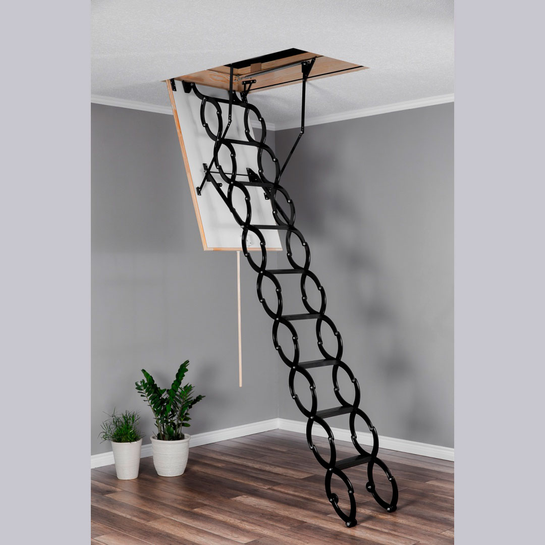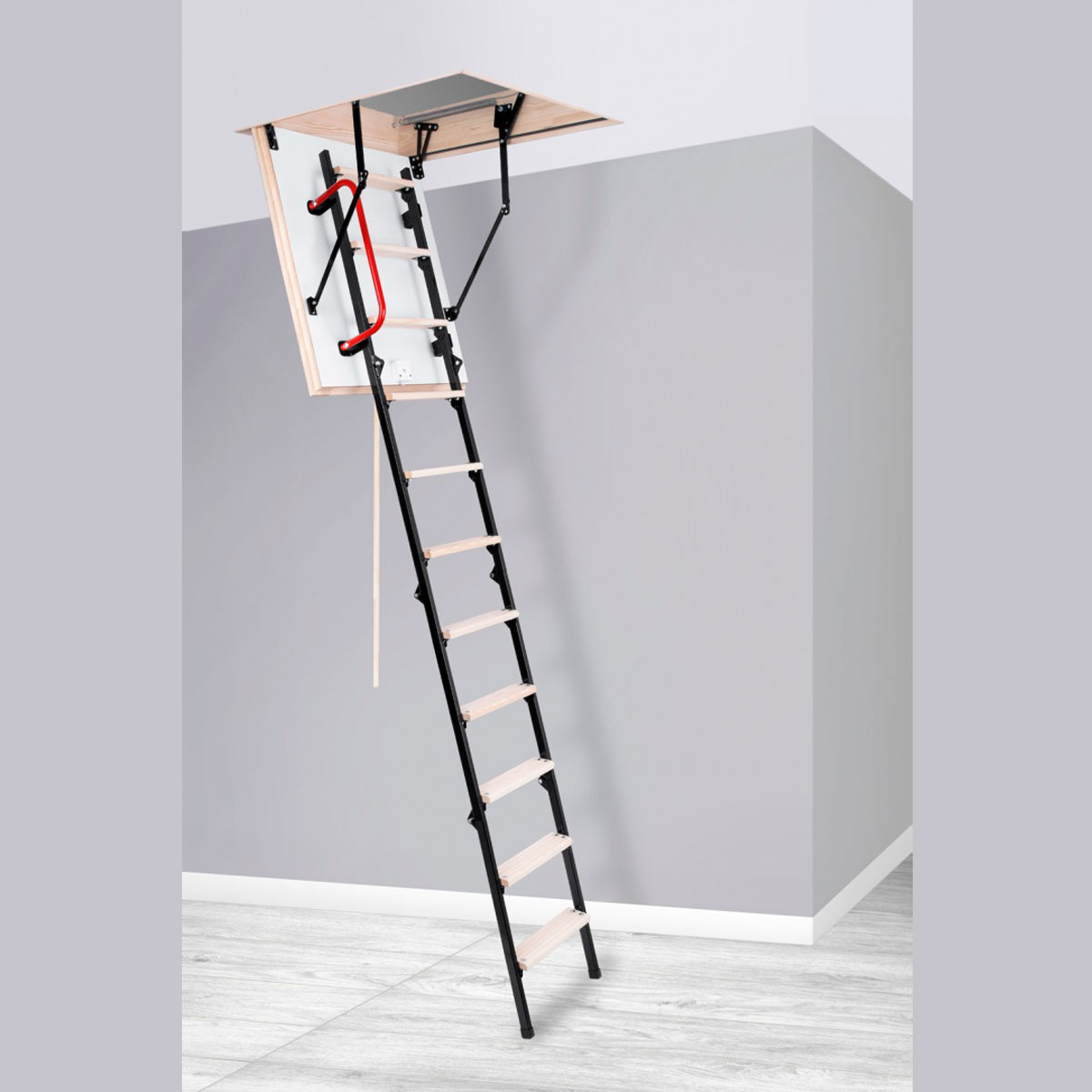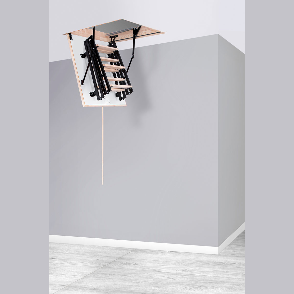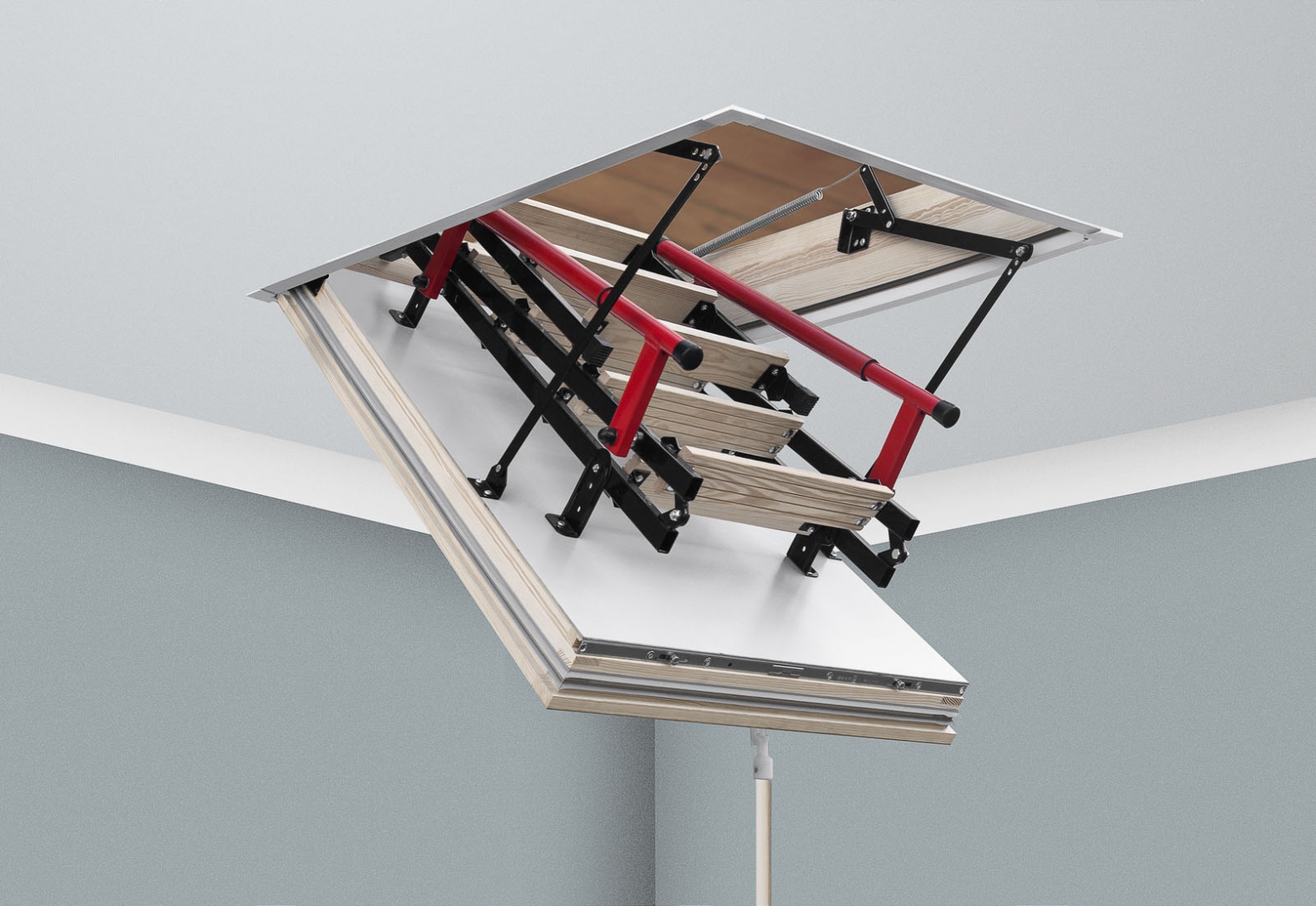 Модель FLEX, благодаря использованию цельнометаллической вытянутой «ножничной» лестницы, идеально подходит для установки в помещениях высотой до 290 см.